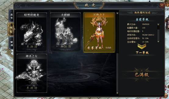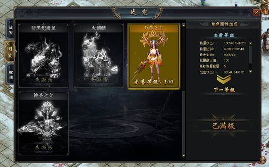 当战宠升级达到条件后,即可消耗对应战宠的精石与战宠宝鉴,对其图鉴进行升级,获得更加强大的属性加成