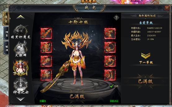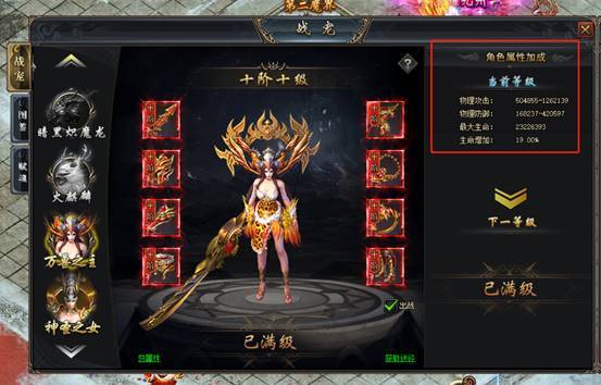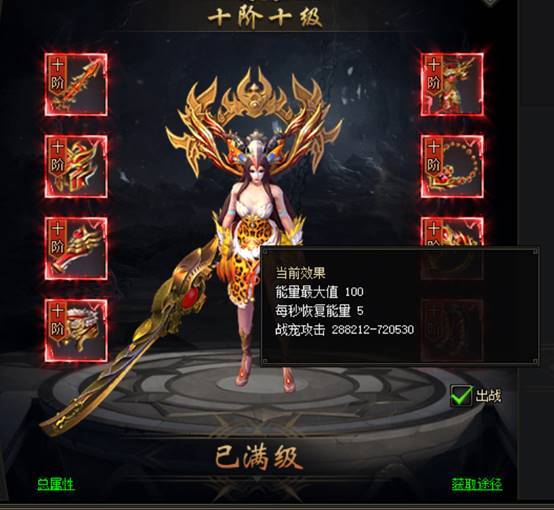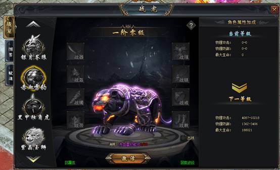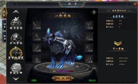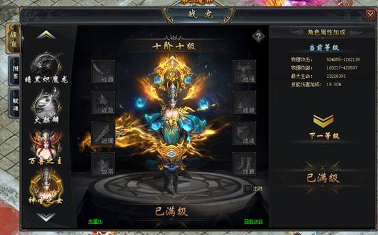 战宠每十级会有一次进阶,进阶后可继续升级战宠,升阶需要消耗对应战宠的碎片
