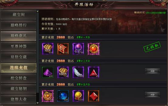 规则:开服7天内,累计充值达到一定充值天数,还可额外领取大礼一份。
