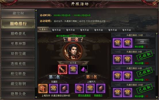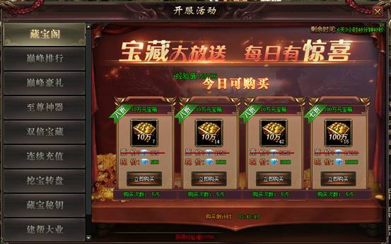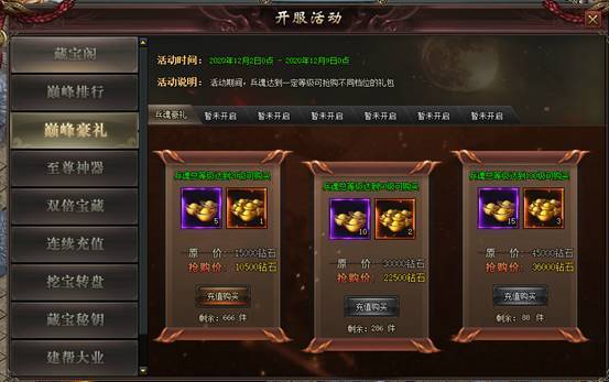 规则:开服7天内,每天可通过巅峰豪礼购买打折材料,每天都有不同豪礼。