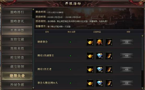 规则:开服3天内,创建帮会并达到相应帮会条件可额外领取豪礼一份!我不做大哥好多年,今天要做回来!