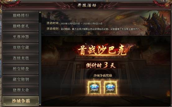 规则:开服第4天,占领沙巴克的帮会帮主将可额外获得一份沙城争霸奖励,丰厚钻石给到你!