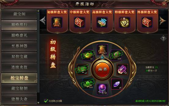 规则:开服7天内,挖宝可获得挖宝积分,消耗挖宝积分可参与挖宝转盘活动,抽取极品大奖,抽的越多,奖励越珍贵!