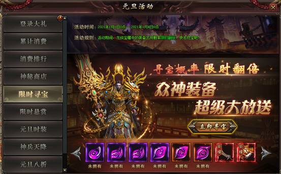 规则:活动期间在龙之宝藏中寻宝,主装抽取概率翻倍,同时还可抽到极品龙脉装备以及荣耀套装等极品装备!