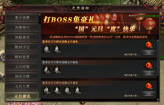 规则:活动期间,所有玩家击杀所有BOSS都可随机掉率“传、奇、国、度、欢、庆、元、旦”,集齐对应道具即可兑换极品奖励