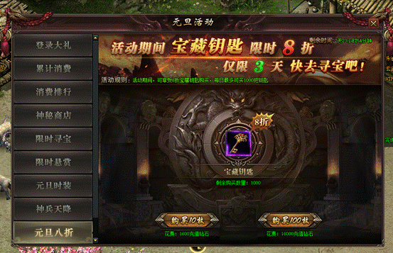 规则:活动期间,所有玩家可享受极低折扣购买宝藏钥匙参与挖宝活动