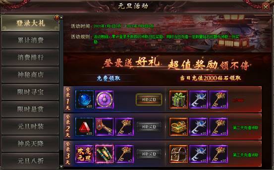 规则:活动期间每天登录即可免费领取超值奖励,;累计登录满3天还可免费领取元旦称号!同时每天充值一定钻石还可以额外领取一份超值豪华奖励。