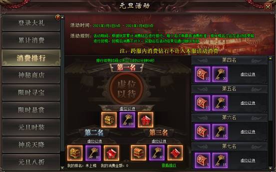 规则:活动期间,累计消费达到指定额度钻石,即可参与排行,第3天活动结束时根据排名,前10名获取排行奖励,奖励以邮件进行发放
