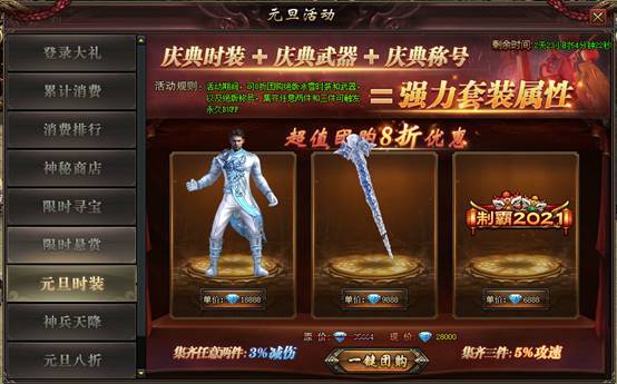 规则:活动期间,玩家可购买元旦庆典时装,拿限定时装BUFF,一键团购还可享受8折优惠。