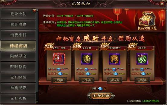 规则:玩家可从神秘商店购买各种市面上难以获取的珍贵物品,奖励每2小时自动刷新1次,期间玩家还可自主刷新选择购买