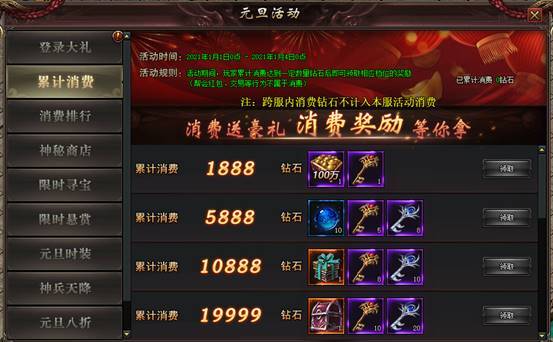 规则:活动期间累计消费钻石达到对应数量,即可免费领取对应奖励